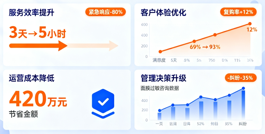 管理决策升级:通过工单数据发现某款面膜过敏咨询集中,及时反馈至产品部门调整配方,减少售后纠纷35%